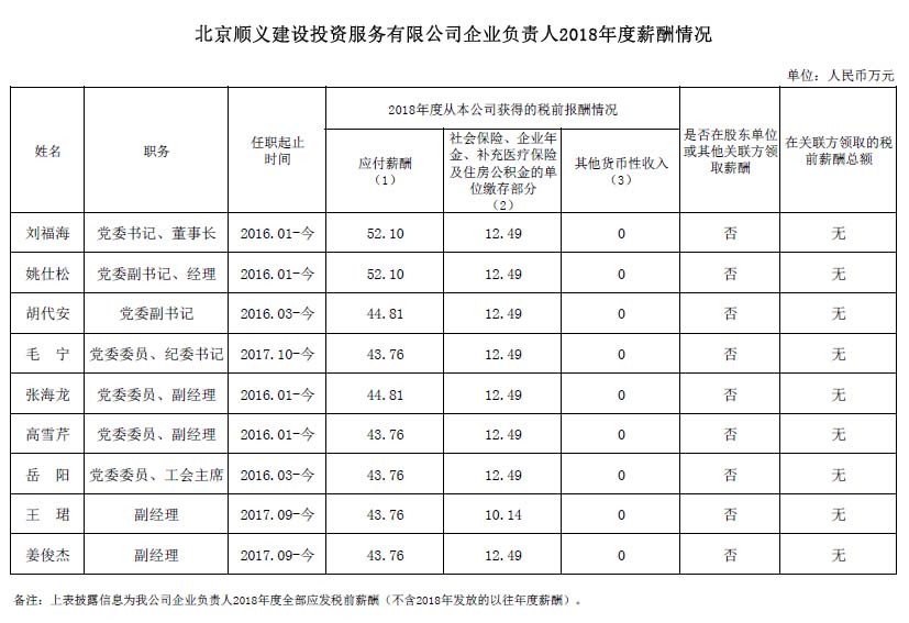 北京順義建設(shè)投資服務(wù)有限公司企業(yè)負責(zé)人2018年度薪酬信息披露