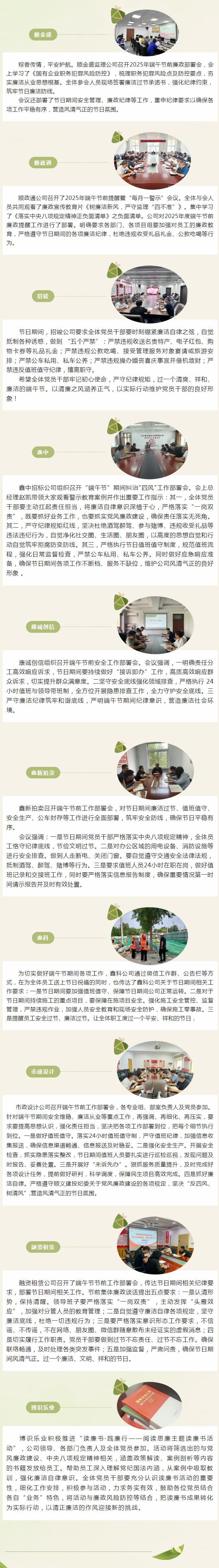 端午佳節(jié)至,清風正氣存。值此傳統(tǒng)節(jié)日來臨之際,為深入貫徹落實中央八項規(guī)定精神,持之以恒糾 “四風”,嚴防 “節(jié)日病”,順義建投各子企業(yè)黨支部開展“端午節(jié)”廉政提醒暨“每月一警示”會議,為全體黨員干部敲響廉潔警鐘,確保節(jié)日期間風清氣正。