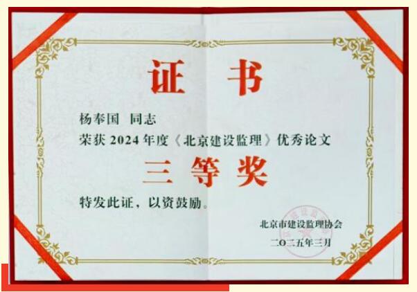 再接再勵(lì)楊奉國(guó),總監(jiān)理工程師,撰寫(xiě)的《鋼筋混凝土灌注樁樁基施工鋼筋籠上浮原因及處理措施淺析》榮獲“2024年北京建設(shè)監(jiān)理優(yōu)秀論文”三等獎(jiǎng)。