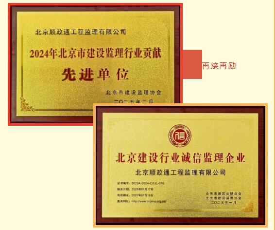 近日,由北京市住房和城鄉(xiāng)建設(shè)委員會(huì)主辦,北京市建設(shè)監(jiān)理協(xié)會(huì)承辦的“北京市2024年建設(shè)監(jiān)理工作會(huì)暨北京市建設(shè)監(jiān)理協(xié)會(huì)第七屆二次會(huì)員大會(huì)”隆重召開(kāi)。順政通在行業(yè)評(píng)選中脫穎而出,榮獲“2024年北京市建設(shè)監(jiān)理行業(yè)貢獻(xiàn)先進(jìn)單位”和“北京建設(shè)行業(yè)誠(chéng)信企業(yè)”雙項(xiàng)榮譽(yù)稱號(hào)。