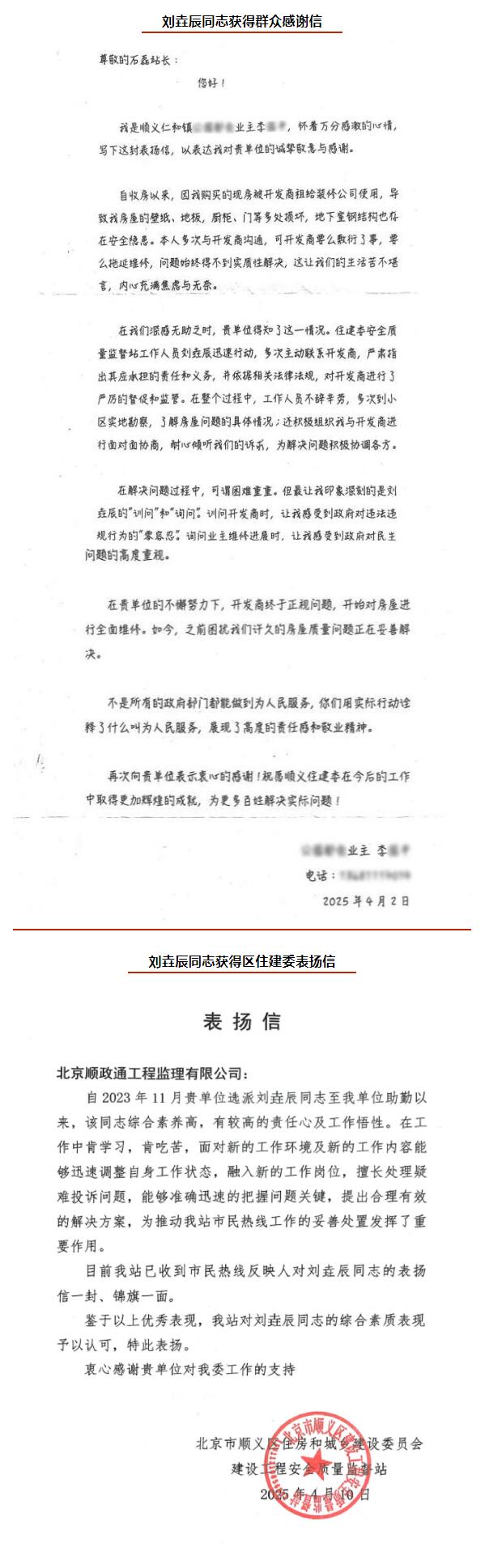 劉垚辰同志在服務(wù)過程中,始終以駐勤工作為中心、以切實(shí)解決群眾需求為導(dǎo)向,變“被動”為“主動”,充分發(fā)揮在監(jiān)理方面的專業(yè)所長,以過硬的業(yè)務(wù)知識,創(chuàng)新工作方式,主動傾聽群眾訴求,加班加點(diǎn)做好協(xié)調(diào),接連獲得群眾致謝錦旗及感謝信,生動詮釋了"民有所呼,我必有應(yīng)"的服務(wù)擔(dān)當(dāng),為助力質(zhì)監(jiān)站相應(yīng)工作的開展貢獻(xiàn)了重要力量,充分展示了順政通員工愛崗敬業(yè)的優(yōu)良品質(zhì),彰顯了順政通公司一貫堅(jiān)守的嚴(yán)謹(jǐn)務(wù)實(shí)、精益求精的工作作風(fēng)。