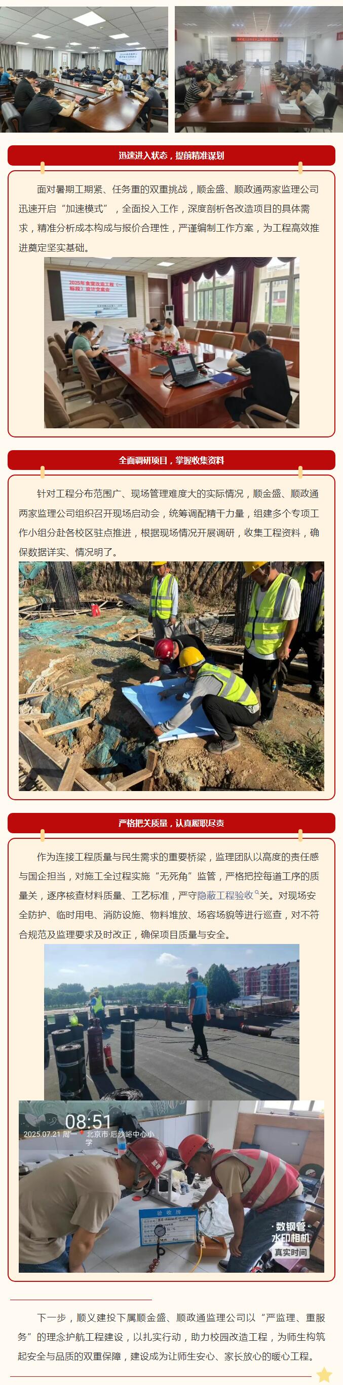 順義建投下屬子企業(yè)順金盛監(jiān)理公司、順政通監(jiān)理公司承接區(qū)內(nèi)部分學(xué)校食堂、校內(nèi)設(shè)施、專業(yè)教室改造,以及供暖系統(tǒng)升級和配套接收學(xué)校改造等多項監(jiān)理項目。面對時間緊、任務(wù)重和標(biāo)準(zhǔn)高等要求,兩家監(jiān)理公司高度重視,周密部署,多措并舉,確保項目按時保質(zhì)完成